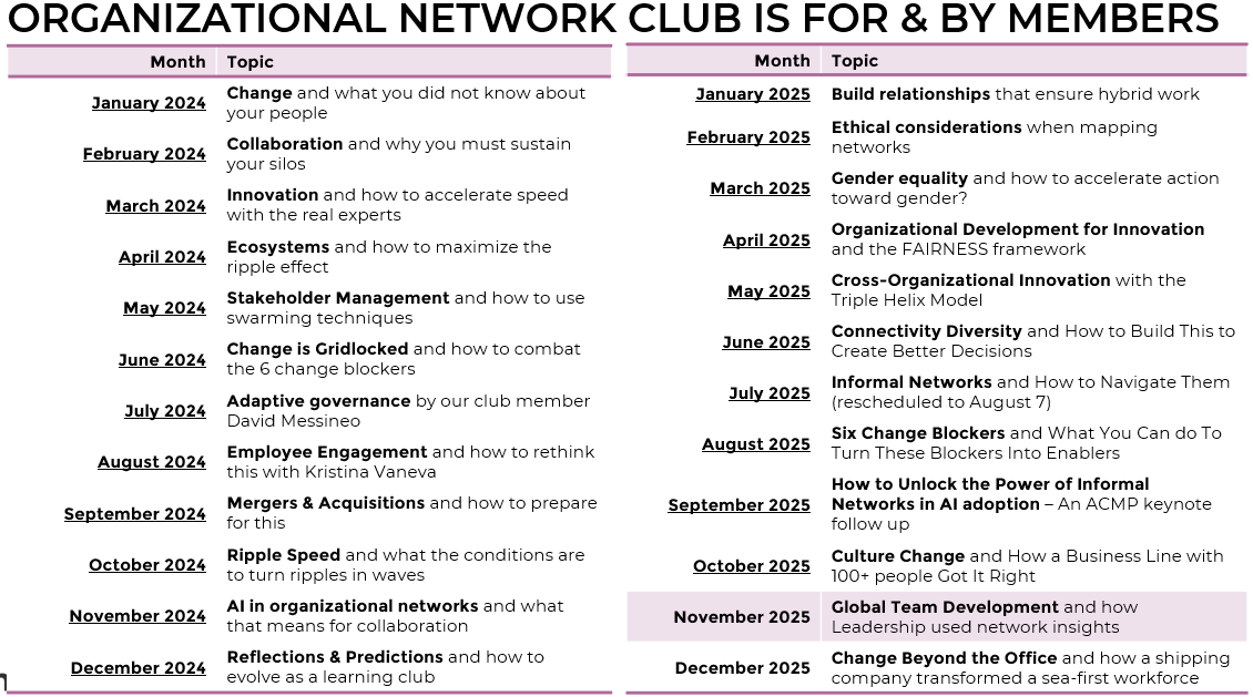 Since January 2024 the Club offers synchronous and asynchronous peer-to-peer learning on how to apply network thinking to change, collaboration, community and ecosystems.